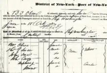 It is believed that through newspapers and promotional materials, Captain Obear contacted Moy's father, and succeeded in reaching an agreement to bring Moy to the U.S. Some sources suggest that Moy was the daughter of a privileged family, and that her father accepted payments for her temporary move to the United States.[10] Other sources hint that she had left China to earn money to send back to her parents in Guangzhou, who were unable to support her.[12] Obear promised to return Moy on his next voyage to Canton in two years (however, Captain Obear re-embarked to Canton on April 1835, and Moy did not accompany him).[1] On 17 October 1834, Moy arrived in the United States aboard Captain Obear's ship, the Washington.[1] She was listed on the passenger list as "Auphinoy"/"Auphmoy".[13][14]