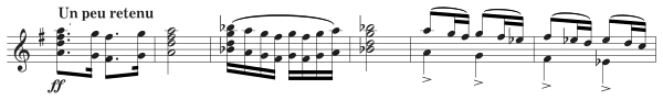 Theme F is a complex motif primarily consisting of triplet sixteenth notes in G major, alluding to a "swarm of drunken wasps". Theme F also serves to prepare the assertive theme G.[8]