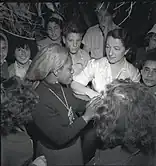 Dance was and is an integral part of West African communal religious expression. This tradition, to the extent permitted by slave holders, continued in the antebellum worship of slaves and other African Americans.[30] One example was the ring shout in the early church. Dancing, especially as a group, became less frequent when African Americans joined more liturgical denominations such as Methodist and Catholic but was more likely maintained in Holiness, Baptist and Pentecostal churches.[31] Individuals often rose to dance when moved to do so. Since the 1970s, liturgical dance has become more accepted as and element of worship even among Methodist and other liturgical churches. The black consciousness movement of the 1960s and 1970s as well as efforts by groups such as The Sacred Dance Guild fostered this dance form,[32] which draws on modern dance and jazz dance. Since the late 1980s gospel mime, in which texts and lyrics are acted out, has found some acceptance in black churches.[30]