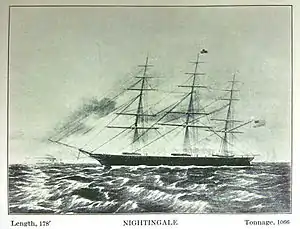 The 1,066 ton clipper ship USS Nightingale originally sailed as part of the American merchant fleet as Nightengale of Boston in China, before trade in that region became unprofitable during the 1850s. She then became a known slave ship until being seized at St. Thomas on January 14, 1861, by the sloop-of-war USS Saratoga. Saratoga's Captain later described the slaver;