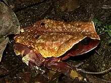 The African giant toad is a large species with a robust body which is a broad ovoid in shape. It has a short snout, an unridged crown and nearly-vertical sides to the head. The eyes are set close together and the upper eyelid has a pointed edge drawn out into a triangular projection. The tympanum is indistinct but the parotid glands are large. The first finger of the hand is longer than the second one, males having nuptial pads on the first two fingers. On the hind limbs, the toes are short and partially webbed. The skin on the back is either smooth or may bear small warts. The upper surface of the head and body is pale brown, yellowish or pinkish. There is a backwards-pointing V-shaped black mark between the eyes and there are sometimes one or more pairs of dark spots on the back. There is sometimes a thin, pale stripe running along the spine. The sides of the head and body are considerably darker than the upper parts. The underparts are grey speckled with white and there is a thin white line bordering the lower jaw. The limbs are barred with dark bands on a greyish or brownish background and the back of the thigh, and sometimes the flanks, are bright red.[6] The combined effect of this colouration is to make the frog resemble a dead leaf and it is well camouflaged when among the leaf litter on the forest floor.[7] The new species differs from the two subspecies in that the posterior part of the abdomen is a darker colour, the line along the spine is dark and the eyelid processes are less-pointed. It is also distinguished genetically from them. There is a 2.2 to 2.8% variation in the 16S rRNA gene, the gene used for investigation, between it and the two subspecies whereas the subspecies are genetically more similar to each other (0.9 to 1.1%) than either of them is to the new species (A. channingi).[4] A. s. chevalieri is the largest subspecies with adult males having an average snout-to-vent length of 127 mm (5.0 in) while A. s. superciliaris averages 121 mm (4.8 in). The new species is shorter again at 109 mm (4.3 in). Females are rather larger than males.[4]