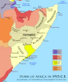 When the Ottoman Empire entered the war in November 1914, the British colonial authorities in British East Africa became apprehensive of attacks from the Muslims of Ethiopia and Somaliland but none transpired until 1916, when trouble also broke out in some Muslim units of the Indian Army stationed in East Africa, including desertions and self-inflicted wounds. In February, about 500 Aulihan warriors from Somaliland captured a British fort at Serenli and killed 65 soldiers of the garrison and their British officer. The British retired from their main fort in the north-east at Wajir and it was not for two years that the Aulihan were defeated.[29] The complications caused by the Ottoman call to Jihad had put the British to considerable trouble in East Africa and elsewhere, to avoid the growth of a pan-Muslim movement. Even when the Ottoman call had little effect, the British were fearful of an African Jihad. To impress the Somali people, some elders were taken to Egypt in 1916 to view the military might of the British empire. The warships, railways and prison camps full of German and Ottoman soldiers made a great impression, which was increased by the outbreak of the Arab Revolt in June.[30][lower-alpha 9]