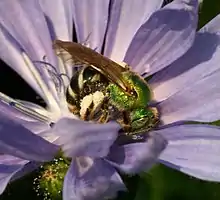 Agapostemon virescens, the bicolored striped sweat bee, is a species of sweat bee in the family Halictidae. It is found in North America,[1][2][3] and is the official bee of the city of Toronto.[4] Like other species in its genus, A. virescens nests underground, in aggregations wherein multiple females share a single burrow.[5]