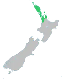 Kauri is found growing in its natural ecosystem north of 38°S latitude. Its southern limit stretches from the Kawhia Harbour in the west to the eastern Kaimai Range.[22] However, its distribution has changed greatly over geological time because of climate change. This is shown in the recent Holocene epoch by its migration southwards after the peak of the last ice age. During this time when frozen ice sheets covered much of the world's continents, kauri was able to survive only in isolated pockets, its main refuge being in the very far north. Radiocarbon dating is one technique used by scientists to uncover the history of the tree's distribution, with stump kauri from peat swamps used for measurement. The coldest period in recent times occurred about 15,000 to 20,000 years ago, during which time kauri was apparently confined north of Kaitaia, near the northernmost point of the North Island, North Cape. Kauri requires a mean temperature of 17 °C or more for most of the year. The tree's retreat can be used as a proxy for temperature changes during this period. While not present in modern days, the Aupōuri Peninsula in the far north was a refuge for kauri, as large quantities of kauri gum were present in the soils.[23]