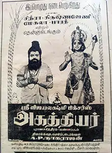 Agathiyar is a 1972 Indian Tamil-language Hindu mythological film written, directed, and produced by A. P. Nagarajan. The soundtrack was composed by Kunnakudi Vaidyanathan. The film stars Sirkazhi Govindarajan playing the main character, T. R. Mahalingam, A. V. M. Rajan, Kumari Padmini, R. S. Manohar, Suruli Rajan, Manorama and Sridevi were in supporting roles. This film ran for 100 days and won widespread appreciation.[2] The film was dubbed into Hindi under the title Maharish in 1986.