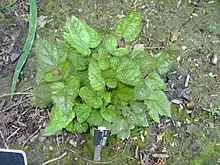 This perennial herb grows 30 to 60 centimeters tall. It has oppositely arranged leaves with thin oval or somewhat triangular blades up to 8 centimeters long by 9 wide. The inflorescence is a cluster of flower heads containing white disc florets and no ray florets.[6]