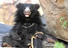 The sloth bear (Melurus ursinus) is a medium-sized omnivorous species of bear found in the Indian subcontinent, predominantly India, with a small population in Nepal and Bhutan, and a sub-species in Sri Lanka. It is listed as vulnerable on the IUCN Red list.[7]