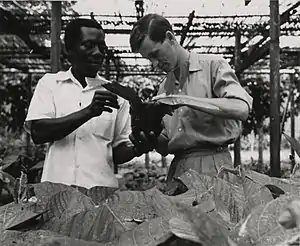 Plant physiologist and his assistant examine a Cacao tree in Ghana in 1957.
