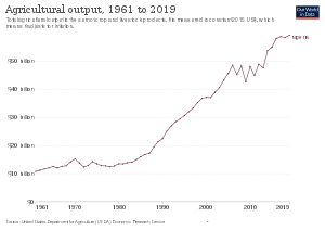 In the third quarter of 2019, before the COVID-19 pandemic, the sector grew by 14.88% year-on-year. Crop production remains the largest part of the sector. During the third quarter of 2019, the agriculture sector contributed 29.25% to the overall real GDP.[10] Between January and March 2021, agriculture contributed 22.35% of the total gross domestic product.[11][12][13][14][15]