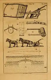 The area of arable land farmed by a family was notionally suitable for two or three plough teams, allocated in runrigs.[17] Runrigs, were a ridge and furrow pattern, similar to that used in parts of England, with alternating "runs" (furrows) and "rigs" (ridges).[19] They usually ran downhill so that they included both wet and dry land, helping to offset some of the problems of extreme weather conditions. Most ploughing was done with a heavy wooden plough with an iron coulter, pulled by oxen, which were more effective on heavy soils and cheaper to feed than horses.[17] They were usually pulled by a team of eight oxen,[20] which would have taken four men to operate and only covered half an acre a day.[21] In the late sixteenth century population growth in the west Highlands prompted an abandonment of ploughing in favour of more intensive cultivation methods using spades and foot ploughs (cas chrom) with lazy beds, which produced larger furrows with narrower channels between and allowed arable cultivation[18] in locations where ploughing would have been impossible.[22] Pasture was often accessed by shieling-grounds, with shelters made of stone or turf, used for the grazing of cattle in summer. These would often be distant from the main settlements in the Lowlands, but might be relatively close in the more remote Highlands.[23] All farms combined livestock with arable farming, with cattle and sheep and goats in parts of the Highlands and all farms growing some grain. However, there was some specialisation, with arable most important in the East and there was a tradition of sheep farming in the eastern Borders dating back to the arrival of new monastic orders in the twelfth century, which continued after the secularisation of the monasteries.[18]