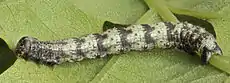 The ground colour of the wings is usually whitish. The forewings are nuanced red brown at the base and the tip, with discontinuous black lines associated with areas streaked with black. The hindwings of the underside are stippled black. Some individuals may be more dark (brown and black stains) and there are named variants. See Prout (1912–16).[1] The female is wingless. The male has a wingspan of 10–30 mm. The egg is long-oval, pointed at one end; light grass-green. The rather stout larva is green with yellow lines and brown dorsal blotches[2]