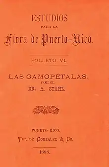Stahl wrote "Estudios sobre la flora de Puerto Rico" (A study of the Puerto Rican Flora), published in 6 fascicles from 1883 to 1888. Copies of Stahl's plant collection with approximately 1,330 plants can be found in various botanical gardens around the world. His collections were the basis for numerous studies by specialists, some of them resulting in new taxa to science.[2][3]
