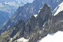 The Aiguille de la Brenva (3,269 metres (10,725 ft)) is a remote rocky mountain peak in the Mont Blanc massif of the Alps. It lies wholly within Italy on a ridge descending south-east from the Tour Ronde. It has been described as "a spectacular fin with a fine E face".[2] It stands on a ridge separating the Entrèves glacier from the Brenva glacier, yet is somewhat overshadowed by its larger neighbours, such as the Aiguille Blanche and the Aiguille Noire de Peuterey. Nevertheless, it is a distinctive peak, offering a number of very challenging climbs, especially on its east face which consists of vertical granite flakes and cracks. On its northern side stands a distinctive, slender rock pinnacle about 60 metres high, known as the Père Eternel.[3]