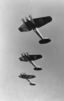 The Chinese Air Force was initially equipped with a mixed-bag of fighter and bomber aircraft at the beginning of the war in 1937 that included the Boeing Model 281 (Peashooter), Curtiss A-12 Shrikes, Curtiss Hawk IIs/Hawk IIIs, Fiat CR.32s, Heinkel He 111s, Martin B-10s, Northrop Gammas, etc., and while giving good account in their many missions against the Imperial Japanese onslaught, these were mostly lost through continued attrition as the war raged on through the end of 1937. The Chinese Air Force however would continue to fight on for years to come as they were replenished through the Sino-Soviet Non-Aggression Pact of 1937, and transitioning almost entirely into Soviet-made Polikarpov I-15, I-153 and I-16 fighters as well as Tupolev SB-2 and TB-3 bombers by 1938. Fighting capacity was greatly bolstered with support from the aviators of the Soviet Volunteer Group, which was active from late 1937 until the end of 1939, and remained stationed in China at limited capacity until December 1940.[48] The Chinese would remain with these increasingly obsolescent aircraft as the Japanese made tremendous advancements in aircraft and engine technologies.[50][51]