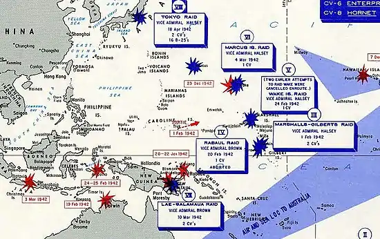 The Doolittle Raid used 16 B-25 bombers (taking off from aircraft carriers[67]) to bomb Tokyo in April 1942. Little physical damage was done, but the episode shocked and stunned the Japanese people and leadership.[68]