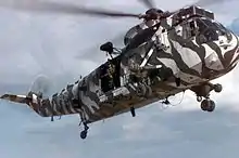 Ground camouflage is used to delay visual acquisition from the air of an aircraft that is on or near the ground. Light sand has been used for aircraft used over deserts, blues and greys for aircraft over the sea, and greens and browns for aircraft that are expected to operate in forested areas.[31] However, a camouflaged aircraft either on the ground or flying low over the ground in bright sunlight remains vulnerable to being detected from above because of its own shadow cast on the ground.[32] This can reduce an aircraft's camouflage effectiveness at altitudes up to 3,000 feet (910 m), particularly if the ground surface is pale and relatively uniform.[32] Helicopters are often painted in ground camouflage, sometimes in regional or seasonal forms such as snow camouflage.[33] Fixed-wing aircraft, too, are occasionally painted with snow camouflage, as for example on Soviet fighters[34] and Luftwaffe Stukas on the Eastern Front in winter,[35] in Swedish trials in 1970,[36] and RAF Jaguars on exercise in Norway.[37][lower-alpha 1]