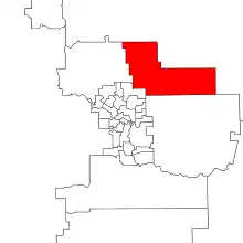 The district is located northeast of Calgary, containing most of Airdrie, except the area west of 8 St SW and south of 1 Ave NW. It stretches west past Keoma to RR253.
