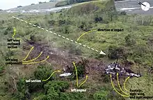 The aircraft crash-landed near the banks of the Guabe River tail-first at 114 knots (211 km/h; 131 mph), with flaps and landing gear retracted. During the impact sequence, the left wing and tail became detached.