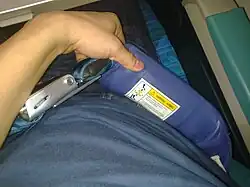 Airplane airbags are airbags that are located in the seat belts on some airplanes. They are designed to lessen the impact of crashes with minor injuries. Dependent on an airline's choice of installation, airplane airbags are most often installed in First class, Business class, Premium Economy, and Economy bulkhead/exit row seats. The use of seat belt extenders deactivates the airbag mechanism, so some airlines require seat belt extender users to be reassigned to seats without airbags.
