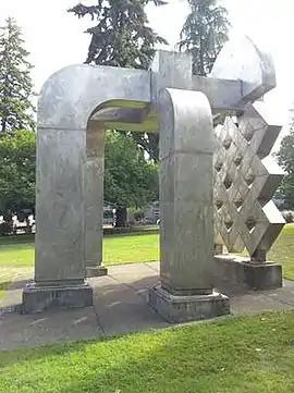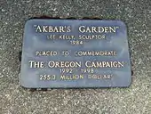 Lee Kelly's Akbar's Garden (1984) is a 17-foot (5.2 m) tooled aluminum sculpture installed in Straub Quadrangle,[1] across from the Student Recreation Center, on the University of Oregon campus.[2][3] The work was donated by art collector and philanthropist Jordan D. Schnitzer and his parents Harold and Arlene Schnitzer in 2002.[3] Before then, it was installed at the Claremont Hotel in Berkeley California.[4] According to the Jordan Schnitzer Family Foundation, Akbar's Garden commemorates the "Oregon Campaign" that raised more than $225 million for the University between 1992 and 1998.[3]
