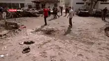 The explosion did not cause significant damage to surrounding buildings.[2] Scorch marks and fire-damaged vehicles, including one vehicle that was flipped over, were observed in the parking lot at the explosion site the following day.[2][32] A crater at the impact site was described as "fairly shallow".[5] French intelligence assessed the crater to be about 1 m (3.3 ft) long, 75 cm (2.46 ft) across, and 30 cm (0.98 ft) to 40 cm (1.3 ft) deep.[33] According to CNN, the impact crater was approximately 3 ft (91 cm) by 3 ft wide, and 1 ft (30 cm) deep.[34]