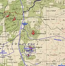 The population grew to 690 in the 1945 statistics, still all Muslim.[3][21] Together with the nearby villages of Shaykh Dannun and Shaykh Dawud, the village had 11,771 dunums of land in 1945.[4] The local economy was based on livestock and agriculture.[22] In 1944/45 a total of 6,633 dunums of land in the three villages was used for cereals, 1,371 dunums were irrigated or used for orchards,[23] and 58 dunams were built-up (urban) land.[24] 300 dunums in Ghabisiyya were planted with olive trees.[22]