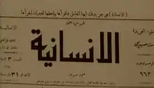 Al-Insaniyyah (Arabic: الإنسانية, 'Humanity') was a weekly Arabic-language newspaper circulated in Lebanon and Syria. It was issued as the organ of the Lebanese People's Party (the public front organization of the Syrian-Lebanese Communist Party).[1][2] The newspaper was launched by the general secretary of the People's Party Yusuf Yazbek on May 15, 1925.[3] Al-Insaniyyah was named after the French communist newspaper l'Humanité. Al-Insaniyyah was the first official Arabic-language communist newspaper.[3] However, it was not a publicly communist newspaper.[1] The first issue of the newspaper declared that it would speak on behalf of the interests of the poor and victims of injustice. The second issue presented the political line of the People's Party, advocating industrial and agricultural development, formation of labour unions, compulsory education and secularism.[3]