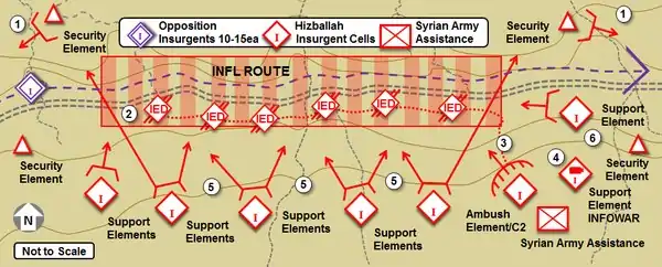 They were then attacked by Hezbollah,[10] who detonated a field of IEDs and then targeted the survivors with machine guns in a successful battle of annihilation.[4] The Salafist rebel group Jaish al-Islam denied reports that it had members in the ambush and said it suffered no casualties.[9] Syrian state media claims most of the rebels were Saudi, Qatari, and Chechen nationals.[6]