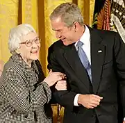 Harper Lee receiving the Presidential Medal of Freedom from President George W Bush
