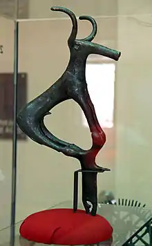 The Alaca Höyük bronze standards are used in stylised form by various organisations as logos, such as the University of Ankara,[1] the city,[2] and the province of Çorum.[3] A massive reproduction of one of the standards stands in the middle of Sıhhiye Square in Ankara.