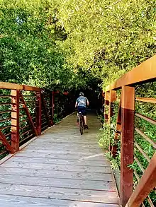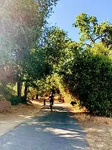 The Los Alamitos Creek Trail or Alamitos Creek Trail is a paved, 4.7-mile (7.6 km) pedestrian and bicycle trail that runs along Alamitos Creek, from Harry Road (south) to Lake Almaden Park (north). As the trail crosses beneath the Coleman Road bridge, it meets the confluence of Guadalupe Creek and becomes the Guadalupe River Trail. A paved trail system which continues along the Guadalupe River extending northward to Chynoweth Avenue. As an alternative to walking under a narrow crawl corridor below the Almaden Expressway bridge, hikers can continue by using sidewalks and the signalized intersection of Coleman Road/Almaden Expressway, trail users can follow the Guadalulpe Creek Trail westward to Meridian Avenue (unpaved, interim gravel surface).[15]