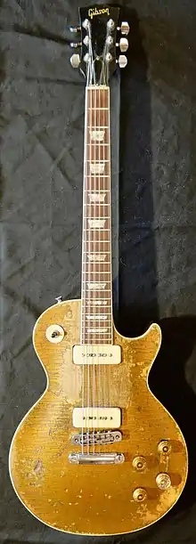 Wilson's mainstay Les Paul Goldtop was not a factory stock model. The stock tuners were replaced sometime prior to Woodstock with modern Grover tuners, as the stock tuning pegs at the time did not keep the instrument in tune as well as later models. In addition, the pick guard and bracket were also removed to provide room for his finger picking style. The model had a stoptail bridge (an adjustable fixed-bridge piece and a separate stopbar or tailpiece) that provided both string support and intonation in one unit. It also featured Gibson P-90 single coil pickups. Both of these latter features were keys to Wilson's tone.[34]