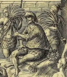 Alauddin Ri'ayat Syah, surrounded by his female guards depicted by Theodor de Bry, 1604 engraving