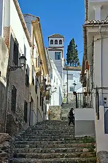 • Church and mirador of San Nicolas: The church overlooking Plaza de San Nicolas, a famous lookout point (mirador) with views of the Alhambra from the top of the Albaicin hill. The original church, built on the site of a former mosque, was in a Mudéjar style in the 16th century.[50][51] It was almost completely destroyed by rioters and looters in 1932 and rebuilt afterwards.[52][51]