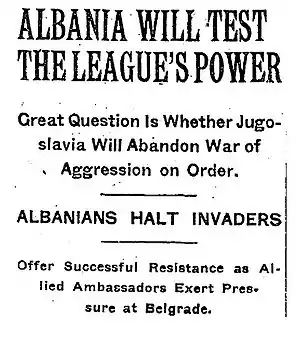 A New York Times headline from 9 November 1921 about the Yugoslav incursion in Albania.