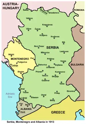 The Serb army first entered Ottoman territory inhabited by ethnic Albanians in October 1912 as part of its campaign in the then-ongoing First Balkan War.[13] The Kingdom of Serbia occupied most of the Albanian-inhabited lands including Albania's Adriatic coast. Serbian Gen. Božidar Janković was the Commander of the Serbian Third Army during the military campaign in Albania. The Serbian army met with strong Albanian guerrilla resistance, led by Isa Boletini, Azem Galica and other military leaders. During the Serbian occupation, Gen. Jankovic forced notables and local tribal leaders to sign a declaration of gratitude to King Petar I Karađorđević for their "liberation by the Serbian army".[14]
