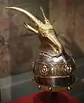 The helmet of Skanderbeg, left; Coat of arms of the Albanian Kingdom (1928–1939), right