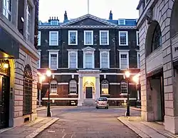 Albany was built in 1771–1776 by Sir William Chambers for the newly created 1st Viscount Melbourne who had bought the land and residence (Piccadilly House) it was to replace from Henry Fox, 1st Baron Holland for £16,500.[1][2] It was called Melbourne House and cost at least £50,000 to build.[3] It is a three-storey mansion, seven bays (windows) wide, with a pair of service wings flanking a front courtyard.
