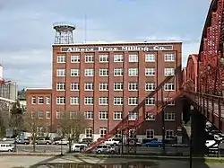 The Albers Brothers Milling Company building is a historic mill and contemporary office building located on the banks of the Willamette River in Portland, Oregon, United States. In the early decades of the 20th century, the German-immigrant Albers brothers built the largest flour and feed milling enterprise on the West Coast, headquartered in Portland and comprising operations in four states. This combined milling, warehousing, shipping, and office facility, built in 1909–1911, is the oldest remaining flour or feed mill in the city.[2] The silos built into the south elevation of the building are painted with representations some of the mill's products as advertisements.[4]