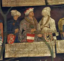 Albert III was born in the ducal residence of Vienna, the third son of the Habsburg duke Albert II of Austria and his wife Joanna of Pfirt.[1] Even though his father had determined a house law, whereby the four sons were obliged to rule jointly and equally, the eldest brother Rudolf IV assumed the reins of government after his father's death in 1358. He reaffirmed his supremacy issuing the Privilegium Maius. However, as his marriage remained childless he again had to share his power with his younger brothers. In 1365 Rudolf IV, Albert III, and Leopold III together signed the foundation certificate of the Vienna University (Alma Mater Rudolphina Vindobonensis); Rudolf died a few months later at the age of 25.