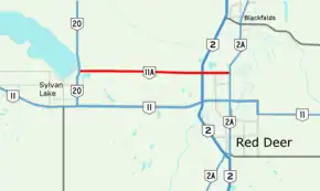 Alberta Provincial Highway No. 11A is the designation of two routes that connect to Highway 11 (David Thompson Highway) in Alberta, Canada.[1] The Rocky Mountain House section is referred to as 11A:02 by Alberta Transportation, while 11A:06 runs from Sylvan Lake to Red Deer.[2]