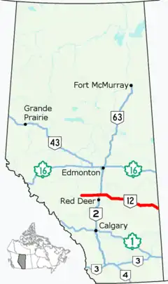 Alberta Provincial Highway No. 12, commonly referred to as Highway 12, is an east-west highway through central Alberta. It runs from Highway 22, through Lacombe and Stettler, to the Alberta-Saskatchewan border. It generally runs parallel to Highway 13 to the north.[2] Highway 12 is about 364 kilometres (226 mi) long.[1]