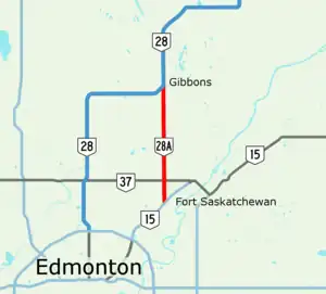 Like most rural two-lane highways in Alberta, Highway 28A is not a controlled-access highway, as numerous driveways and local roads intersect it at-grade. Nevertheless, it forms part of the Edmonton-Fort McMurray corridor and is designated as a core route of the National Highway System.[2] The highway begins at an intersection in northeast Edmonton where it splits to the north from Manning Drive (Highway 15) near 227 Avenue.[3] As 17 Street NE, the two-lane highway proceeds through rural residential and agricultural lands north of Edmonton for approximately 3.5 km (2 mi)to Highway 37, crossing into Sturgeon County.[1] It continues north to the town of Gibbons in which it intersects 50 Avenue and Highway 643 (53 Avenue), approximately 37 km (23 mi) north of downtown Edmonton.[4] A bridge carries a branch of the Canadian National Railway over the highway before the road crosses the Sturgeon River on a culvert. While crossing the river, the road briefly widens to a divided highway then immediately terminates at a trumpet interchange with Highway 28.[3]