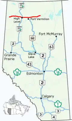 Alberta Provincial Highway No. 58, commonly referred to as Highway 58, is an east–west highway in northwest Alberta, Canada.[2] It starts west of the Rainbow Lake Airport and passes through the towns of Rainbow Lake and High Level before it ends at the Wood Buffalo National Park boundary west of Garden River.[1][3]