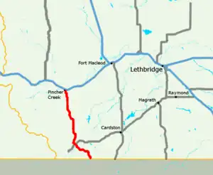 Alberta Provincial Highway No. 6, commonly referred to as Highway 6, is a north-south highway in southern Alberta, Canada. It spans approximately 74 kilometres (46 mi) from Alberta's border with Montana to Highway 3 (Crowsnest Highway).[2][3]
