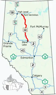Highway 88 begins at its intersection with Highway 2 at the Town of Slave Lake, passing through Red Earth Creek and Fort Vermilion and ending at Highway 58 approximately 57 km (35 mi) east of the Town of High Level. It crosses the Peace River approximately 13 km (8.1 mi) south of Highway 58. The total length of the highway is 428 km (266 mi).[1][3]