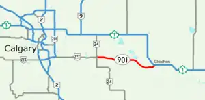 Alberta Provincial Highway No. 901, commonly referred to as Highway 901, is a 40-kilometre (25 mi) in southern Alberta, Canada that extends Highway 22X from Highway 24 to Highway 1 (Trans-Canada Highway) near Gleichen.[2]