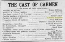 In 1934 Masiello worked as part of a twelve piano ensemble billed as the "twelve Grands" in Radio City music hall.[10] She later performed using her married name, Alberta Masiello Bosco.[11] Numerous recitals as pianist and accompanist, an activity spanning from 1939 when she performed at the White House,[12] performances in Carnegie hall[13] as well as recordings and broadcasts with singers till the 70s. Her husband, Joseph Bosco, died in 1966.[14] In the early 1940s Masiello performed in clubs with Bertlies Weinschenk (also known by her married name as Lys Simonette, and after 1945 Kurt Weill’s assistant) as the two-piano team, "Yola and Lisa" (the Mexican sisters).[15] Between 1944 and 1949 Masiello sang mezzo-soprano roles in regional companies, including Amneris, Herodias[16] and Azucena [17] and Carmen at the New York City Opera Company [18][19] and in Fort Worth.[20] Her vocal career was brief. "I never liked my voice tremendously", she claimed.[21]