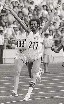 In 1977, he set another world record in the 800, running 1:43.44 in Sofia at the World University Games.[2] He also won both the 400 m and 800 m at the 1977 IAAF World Cup.[12] The 400 m race was mired in controversy when the race was re-run a day after the initial race, in which Juantorena finished third, because Juantorena lodged a successful protest that his slow start had been due to not being able to hear the starter's gun.[13] The latter race featured an epic duel with his great rival Kenya's Mike Boit, a duel that did not happen at the previous year's Olympics because of the African countries boycott.