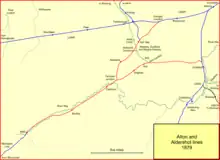 The Aldershot and Alton lines of the LSWR (the London and South Western Railway) were railways developed from 1849 onwards in the region in Surrey and Hampshire, England, between the Southampton main line and Guildford. First was a line from Guildford to Farnham, soon extended to Alton in 1852. The Reading, Guildford and Reigate Railway, an affiliate of the South Eastern Railway (SER), used part of that line by running powers. When the Aldershot Garrison and associated camps opened, suddenly Aldershot had a large population, both civilian and military, and the LSWR built a line from Pirbright Junction, on the Southampton main line. As well as serving Aldershot, this line gave a more direct route from London. It opened in 1870.
